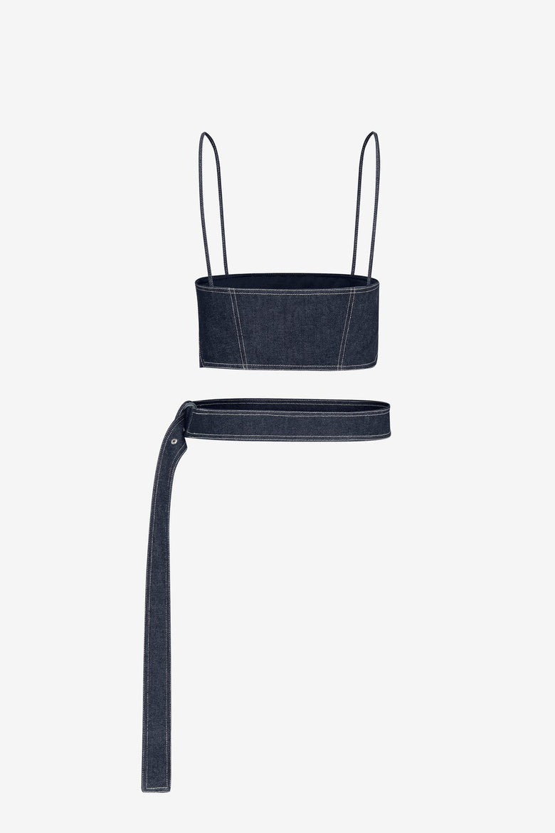 Thin strapped bustier top with wrap around belt and contrast top stitching.