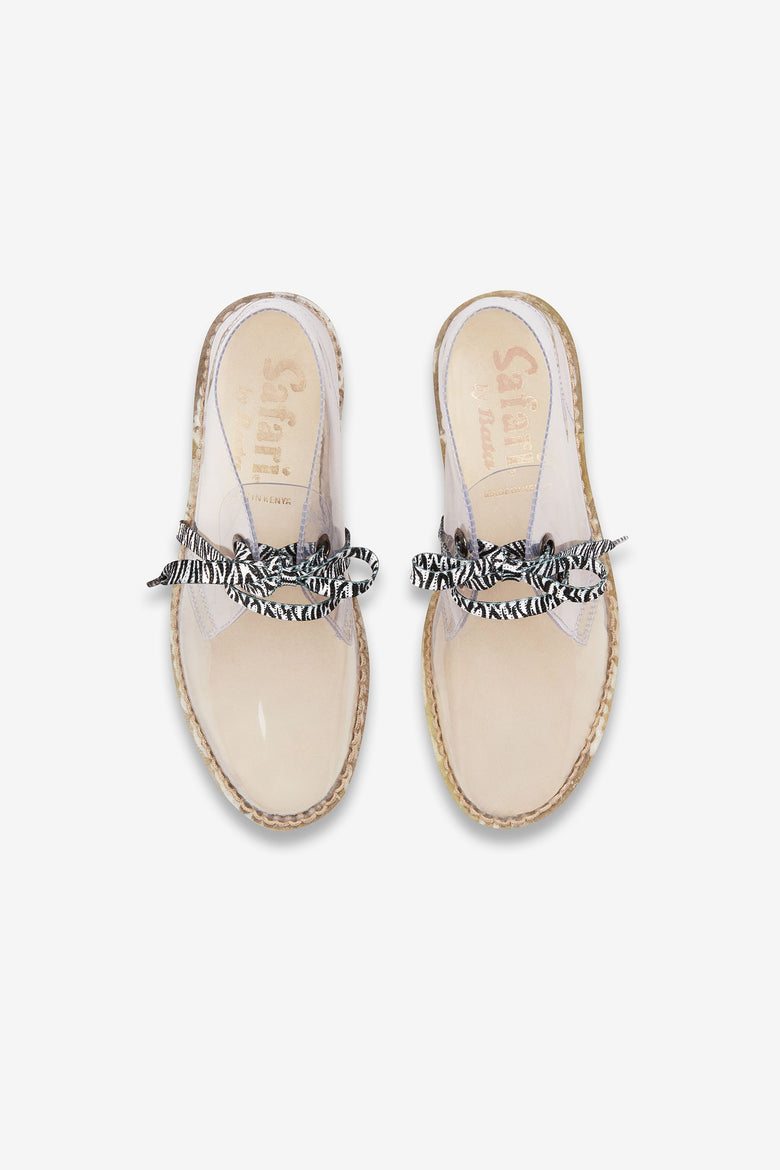 In a common mission to promote sustainable and ethical sourcing and manufacturing in Africa, EDUN and Bata Heritage have collaborated on the iconic Bata Safari boots for Fall/Winter 2017. The Bata Safari Boot was inspired by the Veldtschoen leather boots that South African farmers wore at the turn of the century. With a standard stitch-down construction, it proved capable of withstanding the toughest conditions of the African savannah and became a favorite of local guides. It has since been one of Kenya’s best-selling shoes, popular with locals and tourists alike. For this collaboration, the boots have been revisited in unexpected materials such as white patent leather and PVC with lurex zebra laces, which give a luxurious and urban touch to the African heritage.
