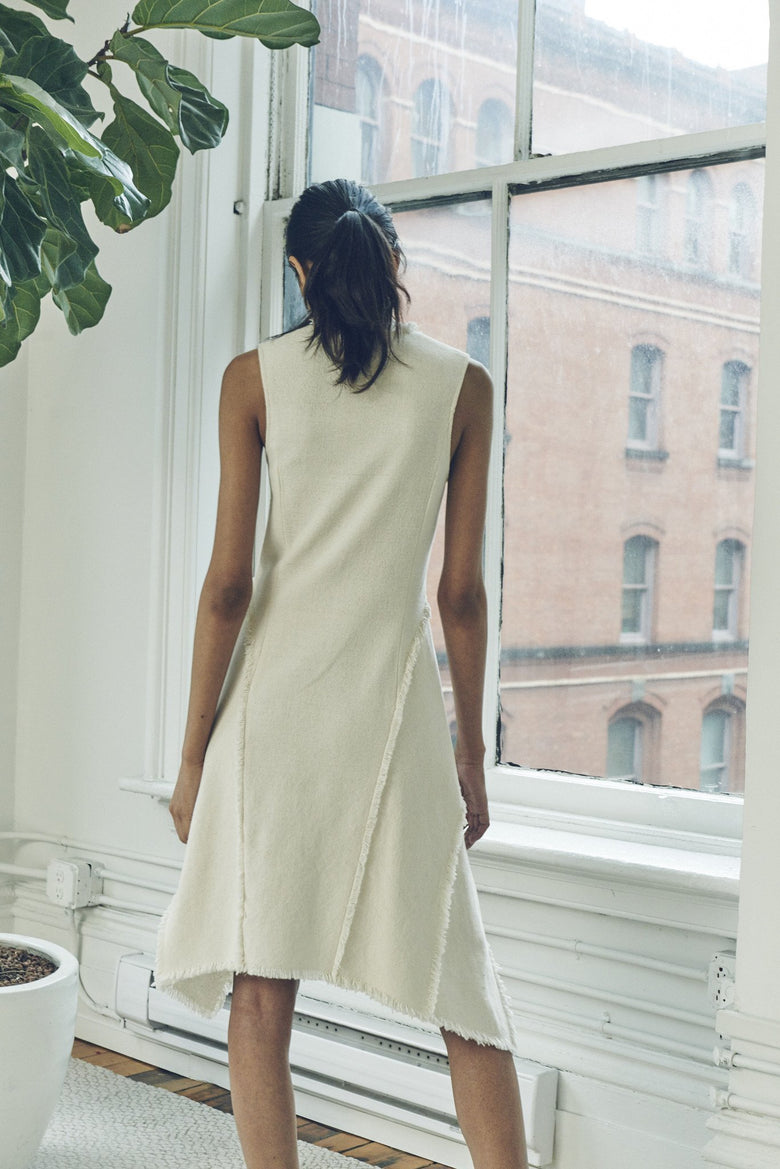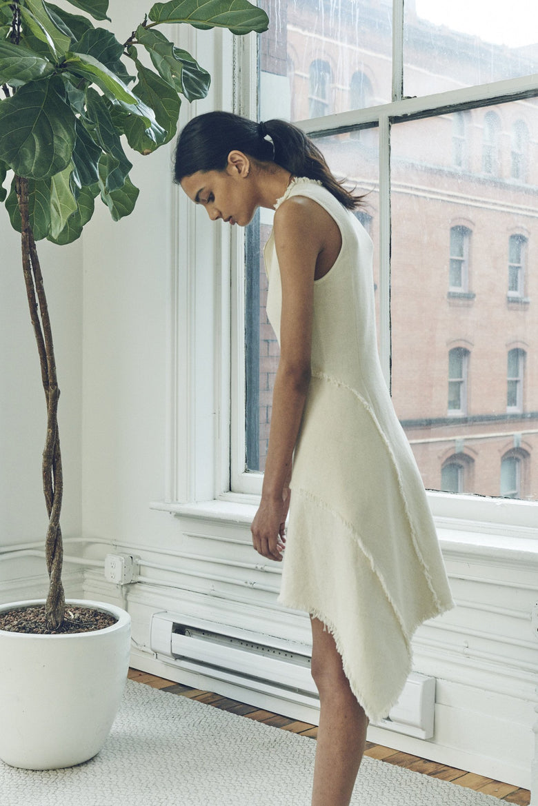 Tiered layer dress with handkerchief hand fringed hemline and exposed front zipper closure.
