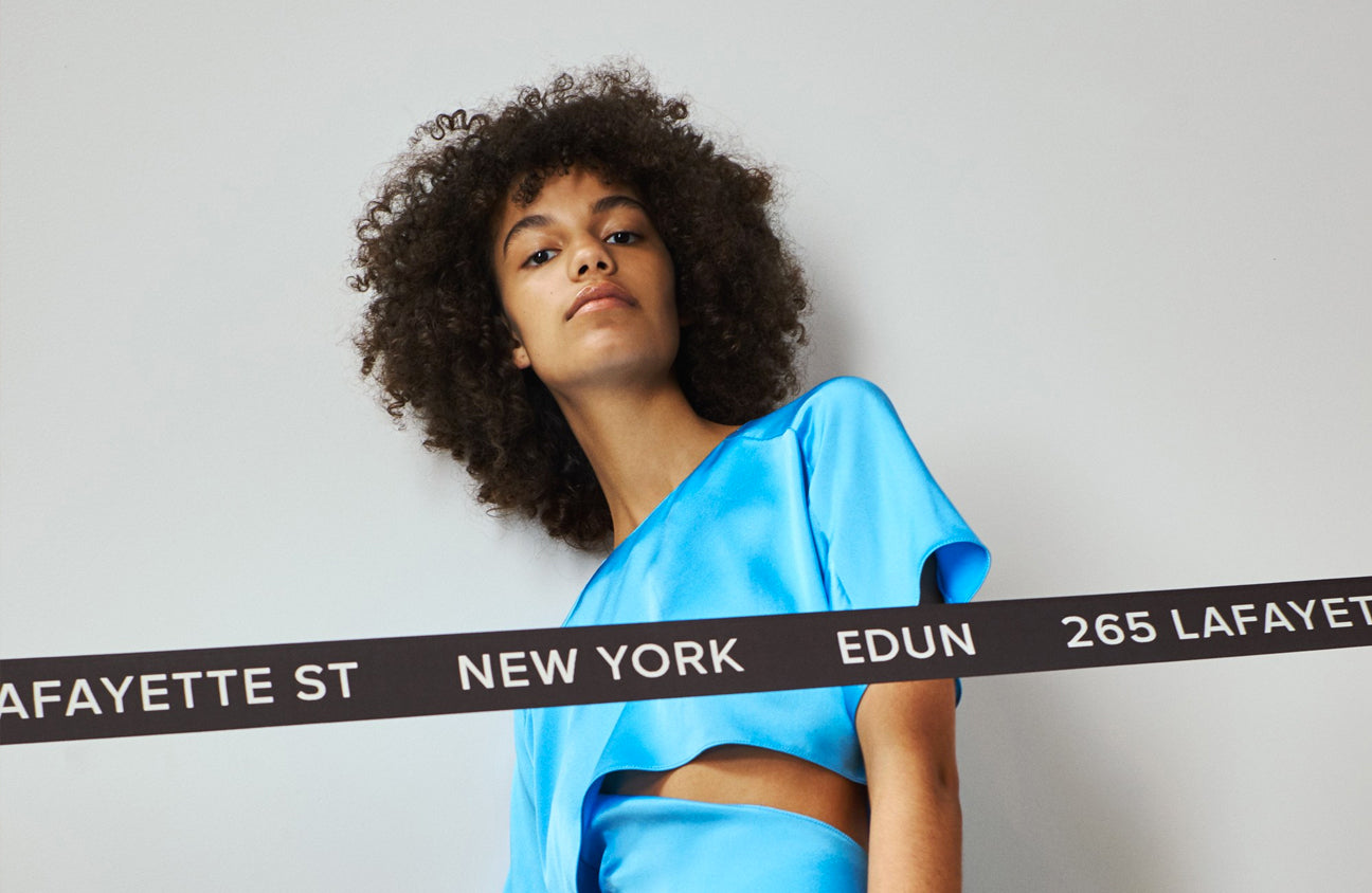 The majority of EDUN’s production is currently made in Africa, between Kenya and Madagascar. The sourcing of each collection is a mix of innovative eco solutions (organic, recycled, and upcycled fabric) and artisanal custom-made fabric developments and embellishments made in Africa.